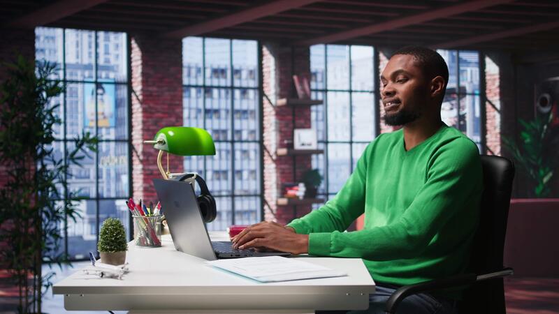 African american male teleworker completing spreadsheets on laptop, entering numerical data into cells and calculating totals. Guy using spreadsheet software functions. Camera B. Pro Video
