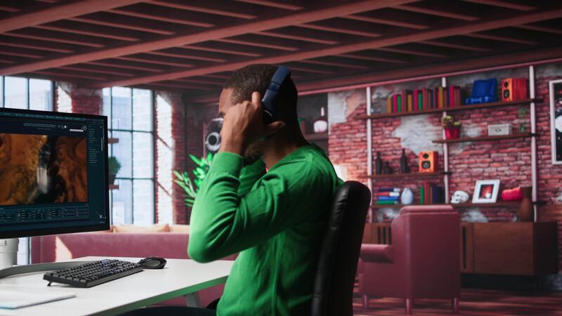 African american guy exploring art and deep learning visuals on a monitor. Uses predictive technology, virtual assistants and programs to bring prompts to life. Camera B. Pro Video