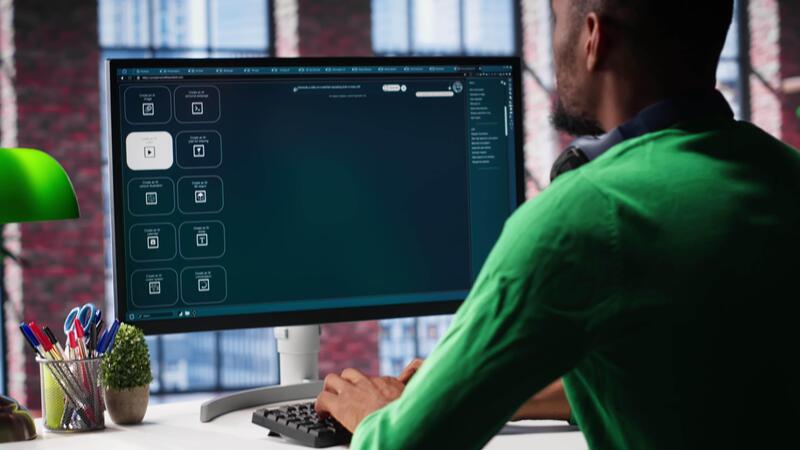 Computer screen displays digital visuals generated through AI. Young person uses software combining data and machine learning, text prompts to design graphics at home office. Camera A. Pro Video