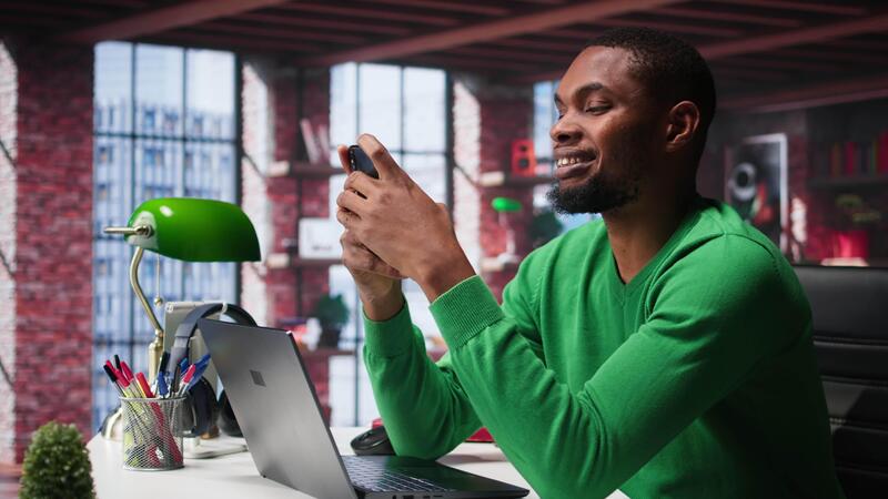 Man at home using smartphone to compose social media posts, producing content as a freelancer. African american guy monitoring profile engagement using mobile phone. Camera B. Pro Video