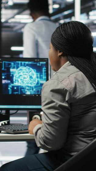 Vertical Data center coworkers doing brainstorming, using artificial intelligence machine learning models to configure equipment. IT experts cooperating in server farm, working on optimizing systems, camera B Pro Video
