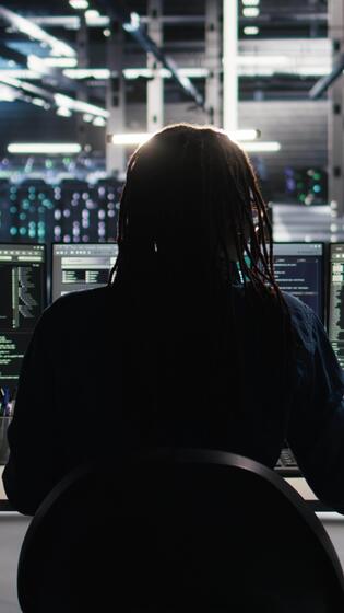 Vertical Data center engineer implements AI virtualization frameworks to optimize server clusters. Server hub IT professional doing artificial intelligence predictive analysis, camera A Pro Video