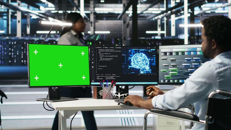 Data center admin in wheelchair using AI node tree software on green screen PC to minimize system downtime. Server hub employee in disability using visual programming tool on mockup computer, camera B Pro Video
