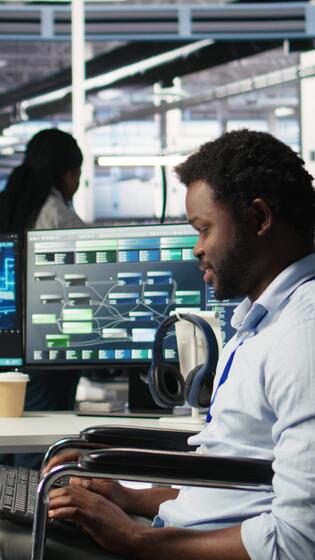 Vertical Stressed engineer with paraplegia in data center panicked by AI node tree software critical error. Anxious server hub worker in wheelchair worried by visual programming tool glitching, camera A Pro Video