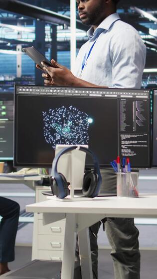 Vertical Data center technician using tablet to do node tree programming, optimizing resource allocation. Server room IT expert using predictive AI visualization systems for maintenance planning, camera A Pro Video