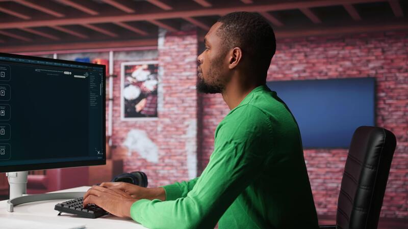 Black graphic designer working in loft with AI image generator software. Digital screen displaying visuals created through machine learning and cloud computing, . Camera B. Pro Video