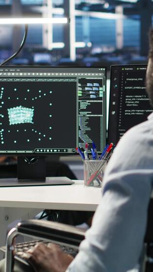 Vertical Overworked man in wheelchair upset by error warning popup while looking at server hub AI analytics metrics. Data center worker with disability irked by malfunction while using node tree tool, camera B Pro Video