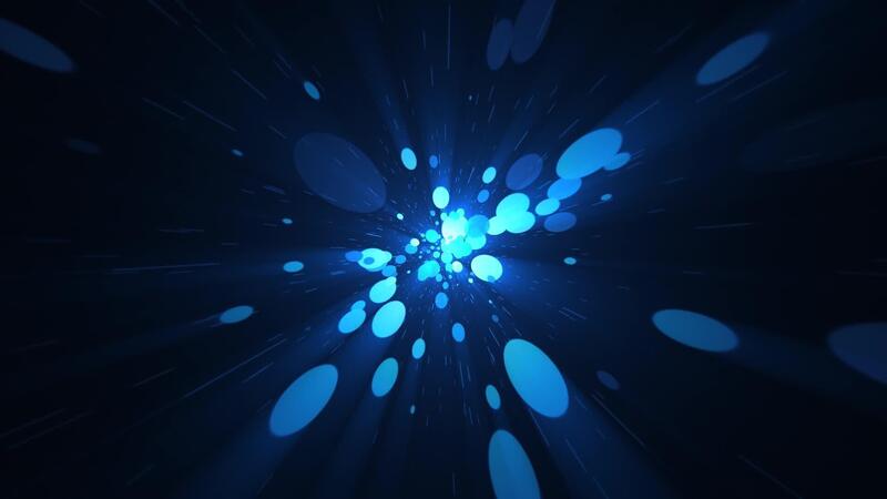 Particle background with blue sphere particles, stars and light beams flowing towards the camera. Full HD and looping abstract space background animation. Free Video