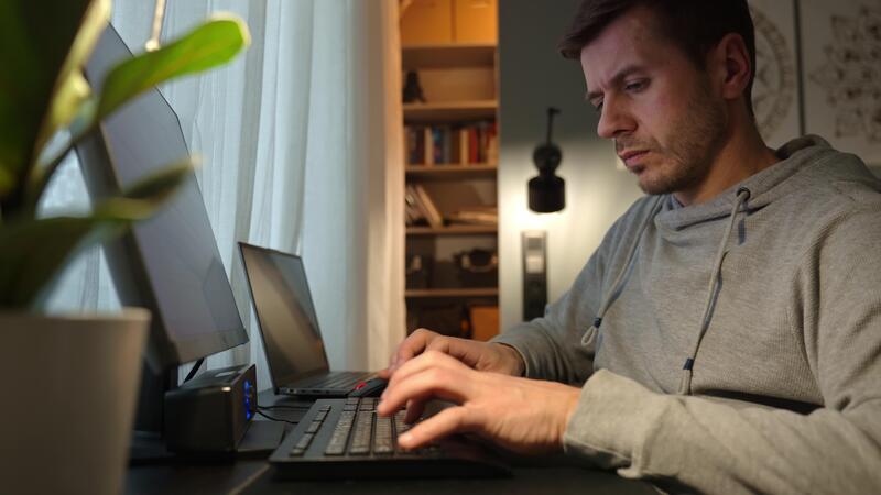 Man sitting by table and looking at computer monitor. Concentrated freelancer using desktop and laptop by window. Remote work from home office Pro Video