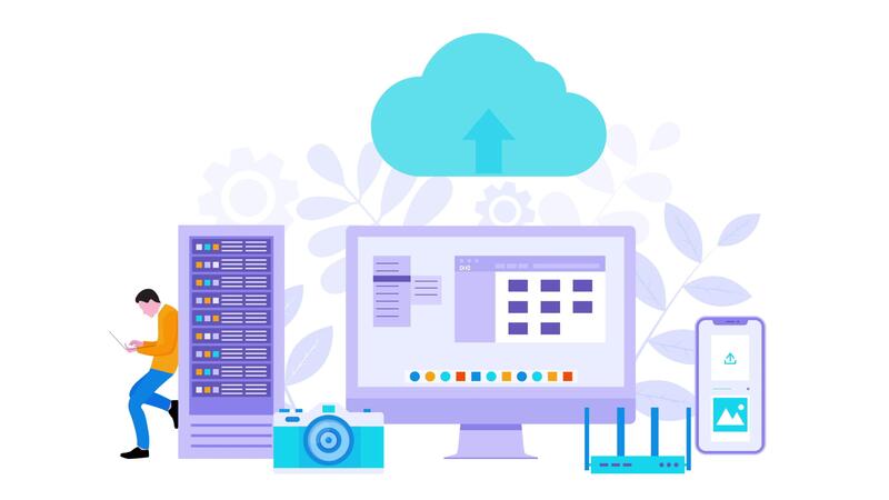 Cloud computing system technology with character animation, Modern cloud technology with data center. Web hosting concept. 4k Pro Video