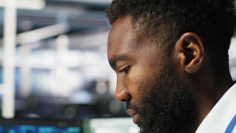 Server farm computer scientist interprets data analytics graphs. African american man in data center using artificial intelligence program showing predictive system metrics, camera B Pro Video