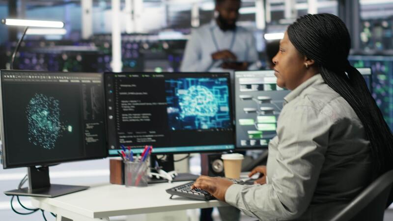 Data center admin does machine learning node tree programming, optimizing resource allocation. Server room worker uses predictive artificial intelligence visualization systems for maintenance, camera B Pro Video