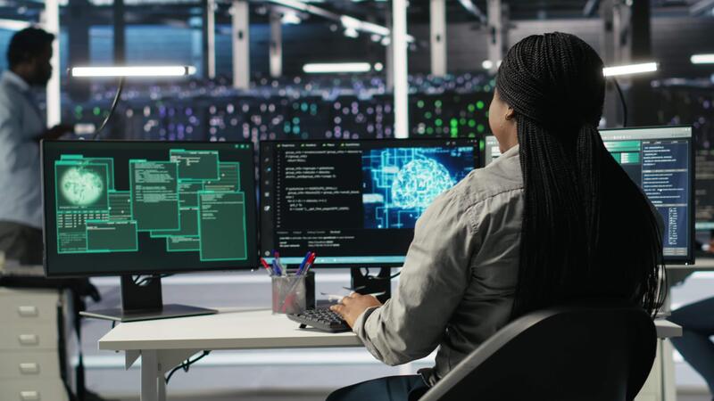 Server hub coworkers react to security breach after unauthorized access bypassing firewall compromising data. Employees initiate emergency response protocols after cybersecurity alert, camera B Pro Video