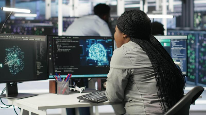 Server room specialist applies artificial intelligence technology to minimize system downtime. African American worker develops and deploys AI solutions to optimize data center equipment, camera B Pro Video
