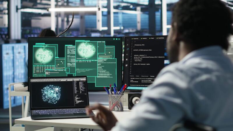 Man with paraplegia in server hub trying to protect hardware from hacker attack stealing sensitive information. Data center specialist in wheelchair fighting virus during security breach, camera B Pro Video