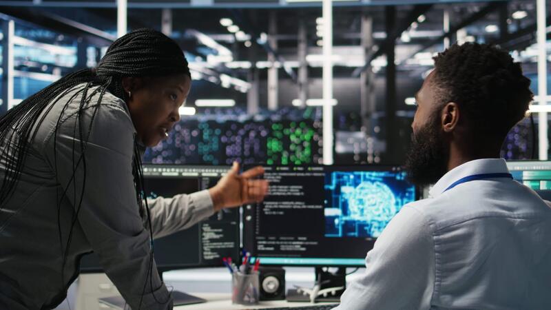 Data center supervisor overseeing work done by engineer using deep learning algorithms to analyze datasets. Server room team leader worker supervising using AI tech to recognize data patterns Pro Video