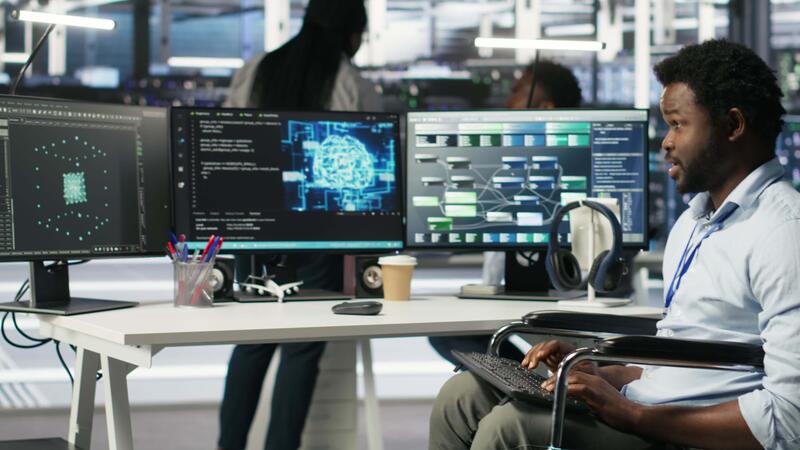 Stressed engineer with paraplegia in data center panicked by AI node tree software critical error. Anxious server hub worker in wheelchair worried by visual programming tool glitching, camera B Pro Video