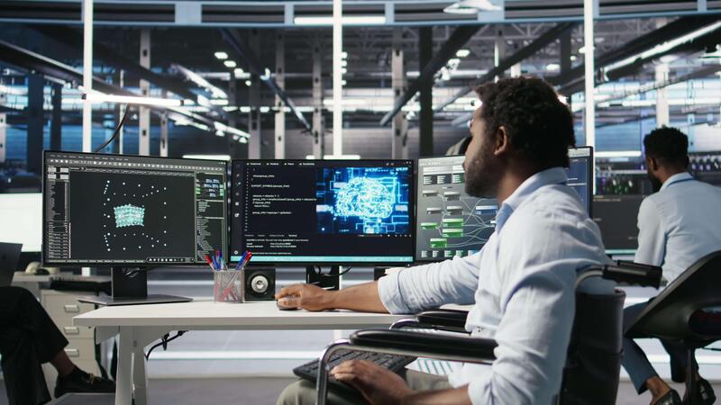 Overworked man in wheelchair upset by error warning popup while looking at server hub AI analytics metrics. Data center worker with disability irked by malfunction while using node tree tool, camera A Pro Video