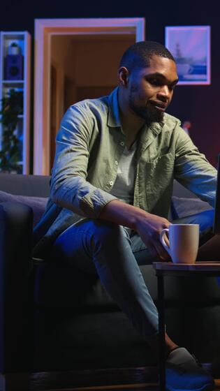 Vertical Self employed guy browsing the web and listening to music, having fun with songs on headset and completing tasks. African american man laying on sofa and relaxing in the living room. Camera A. Pro Video
