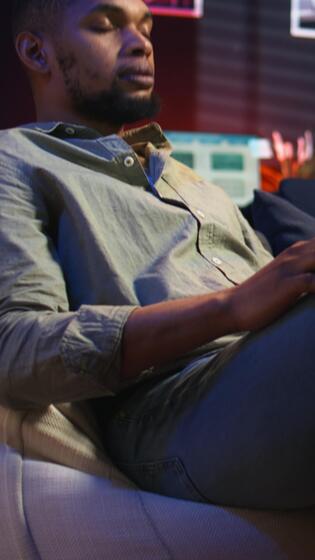 Vertical Black male freelancer taking online course to learn new skills from home, attend online call and watching lecture from loft. Young man participates at a virtual training class. Camera A. Pro Video