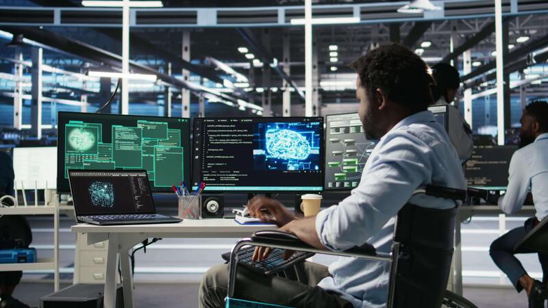 Man with paraplegia in server hub trying to protect hardware from hacker attack stealing sensitive information. Data center specialist in wheelchair fighting virus during security breach, camera A Pro Video