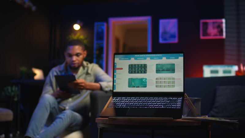 Black remote worker navigating on tablet next to screen running analytics, sitting at home working on his daily tasks with multiple devices. Leisure and job productivity in loft. Camera A. Pro Video