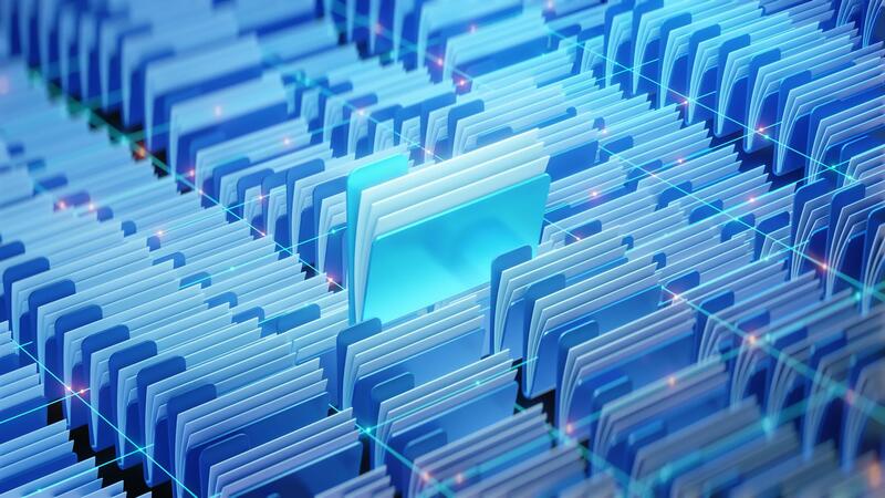 Glowing digital folders arranged in a virtual grid system represent modern document management, data organization, and cloud file storage. Pro Video