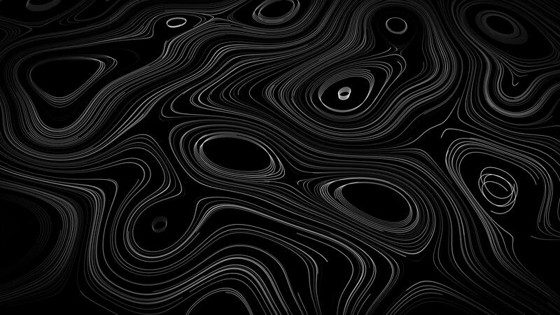 Turbulence of particle lines. Digital technological animation. Abstract animated contour topographic. Contour map or topographic texture. Moving waves on a black background. 4K Pro Video