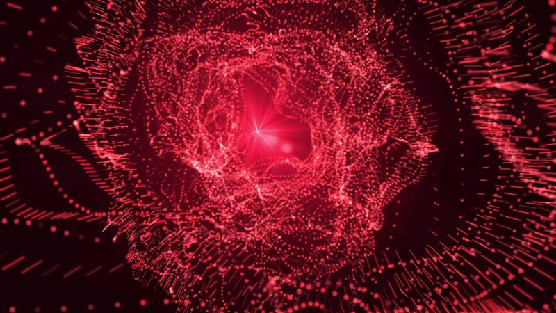 Abstract red particles with random movement. A tunnel with a pulsating light inside. 4K nimtsiya Pro Video
