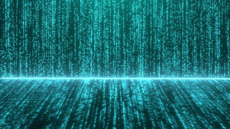 Abstract glowing chaastic lines falling with glowing bokeh effect and floor reflection on black background. Data flow. Abstract digital technology background, animated cyber or technology background. Pro Video