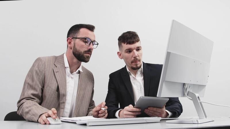 Two business men are brainstorming in a bright office, working and analyzing data from a computer. The concept of successful business and teamwork Pro Video