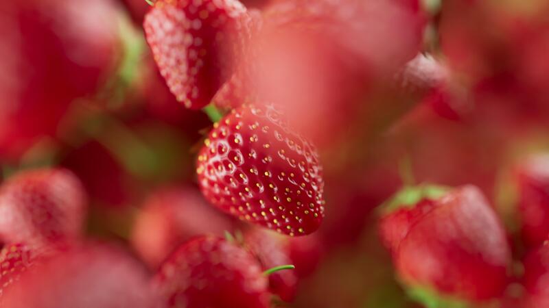 Looping animation of a group of strawberry. Many strawberry slowly rotate in the background in space. Horizontal composition. Defocus. Close-up. Cycle. Pro Video