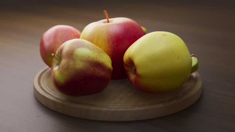 Looping animation around a composition of apples lying on a wooden board. Loop motion. Defocus. Close-up. Pro Video