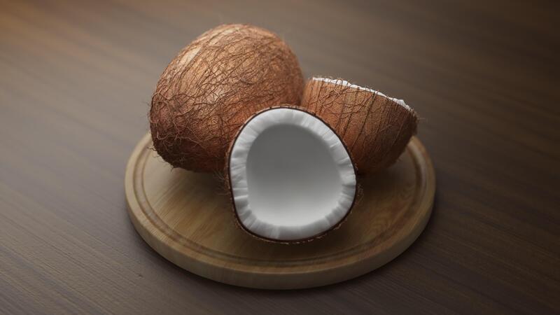 Looping animation around a composition of hairy coconuts lying on a wooden board. Loop motion. Defocus. Close-up. Pro Video