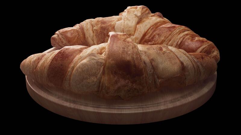 Looping animation around a composition of two croissants lying on a wooden board. Loop motion. Alpha Channel. Close-up. Pro Video