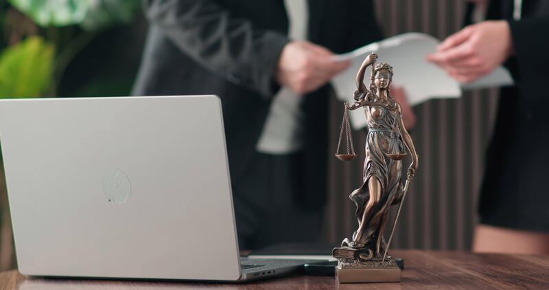 A laptop and a statue of justice against a background of business people shaking hands while discussing a course of action Pro Video