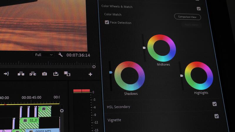 editing interface showing color wheels and timeline, Close-up of editing software screen with color tools and media timeline Pro Video