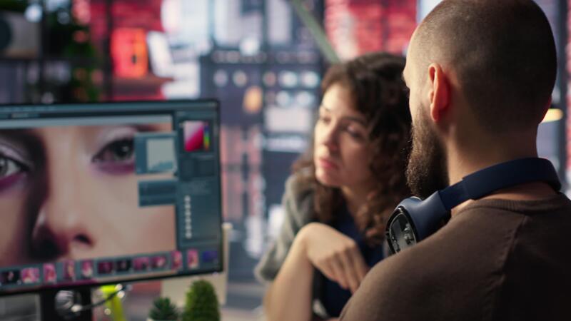 Graphic designer and photographer collaborate in a modern studio, using photo editing software and tools on PC. Team does retouching with advanced image adjustment tools. Camera B. Pro Video
