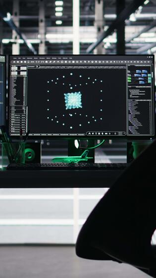 Vertical Monitors in data center displaying node tree programming optimizing infrastructure health. Visual programming systems on workstations detecting server room equipment malfunctions, jib up shot Pro Video