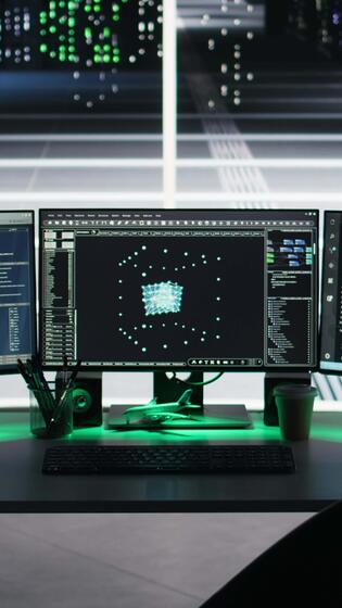 Vertical Server farm computer systems controlling network resources through node tree programming software. Visual programming tools on PC screens enabling streamlined data processing Pro Video