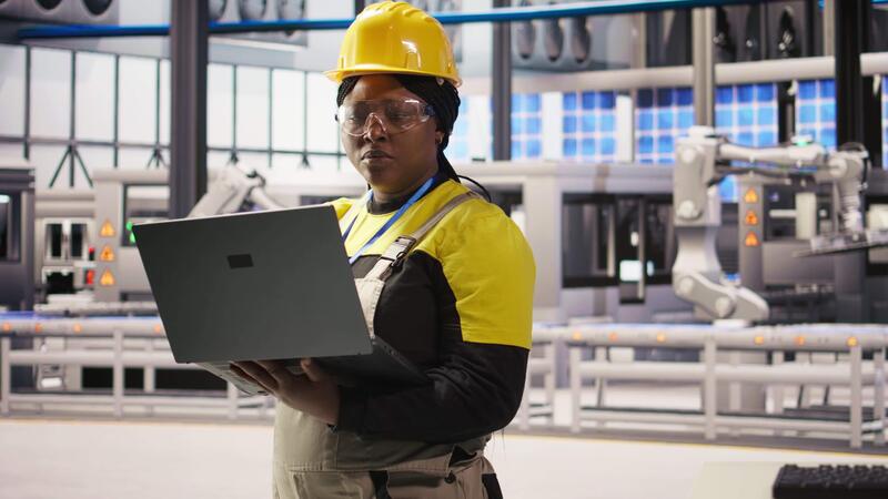 Solar panels factory engineer analyzing data from IoT sensors to refine equipment operational efficiency. Worker performing system diagnostics to reduce downtime in photovoltaic production, camera A Pro Video
