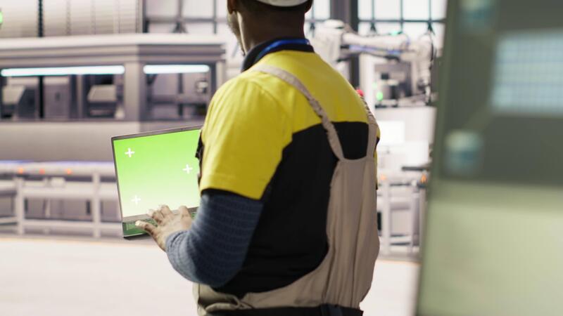 Smart factory mechanic testing automated systems using isolated screen laptop, doing maintenance. Industry 4.0 plant serviceman inspecting equipment using mockup notebook to identify errors, camera B Pro Video