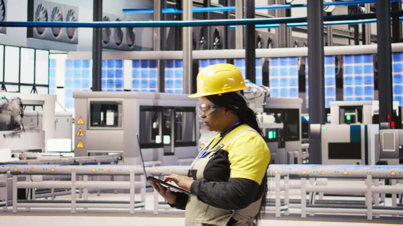 Smart factory engineer using laptop to implement automated workflows and control systems, computerizing operations. Technician integrates sensors into production using notebook, camera A Pro Video