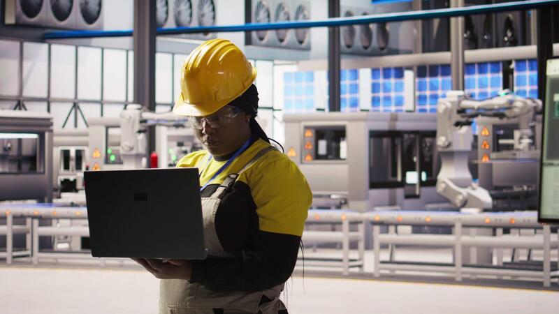 Portrait of smiling solar panels factory engineer analyzing data on laptop to predict gear failures. Happy photovoltaics plant employee using notebook, following maintenance procedures, camera A Pro Video