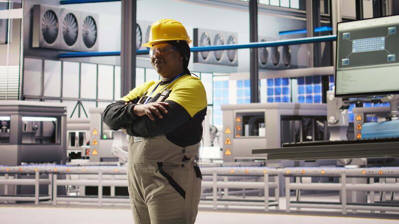 Portrait of jolly smart factory engineer calibrating high tech machinery and analyzing sensor data. Happy industrial plant worker troubleshooting assembly equipment, camera A Pro Video