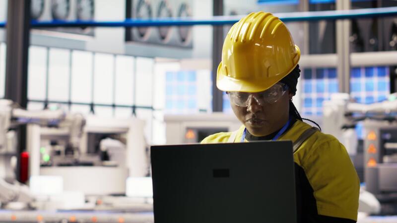 Portrait of smiling solar panels factory engineer analyzing data on laptop to predict gear failures. Happy photovoltaics plant employee using notebook, following maintenance procedures, camera B Pro Video