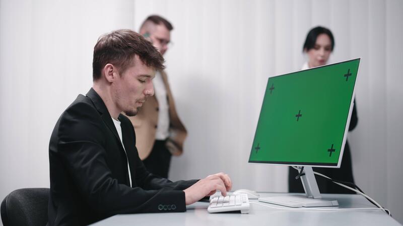 IT technician working at a desktop computer with a Chroma Key green screen, while colleagues brainstorm in the office. Concept e-commerce development, marketing, and data analysis in the office Pro Video
