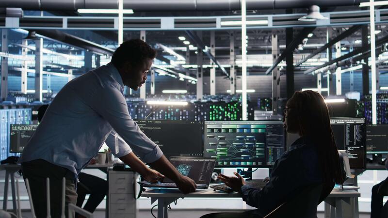 Server hub team leader and worker using node tree software to optimize system health. Data center manager supervising IT expert analyzing infrastructure issues using AI visualization, camera A Pro Video