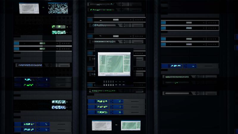 Server room computer overseeing gear delivering processing capacity for AI powered automation and database hosting. Central system controlling devices used for high speed data transfers, zoom out shot Pro Video