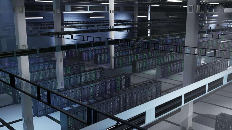 Dark data center operating massive datasets used in machine learning processes. Server farm mainframes operating computational hardware dedicated to processing AI workloads o, trucking left shot Pro Video